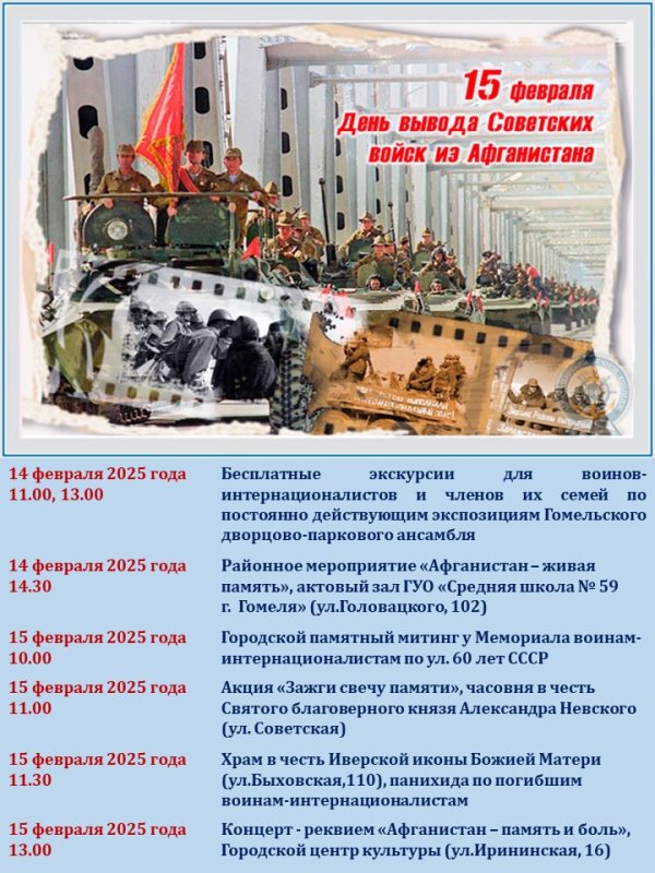 Приглашаем посетить памятные мероприятия, посвящённые 36-ой годовщине вывода войск из Афганистана