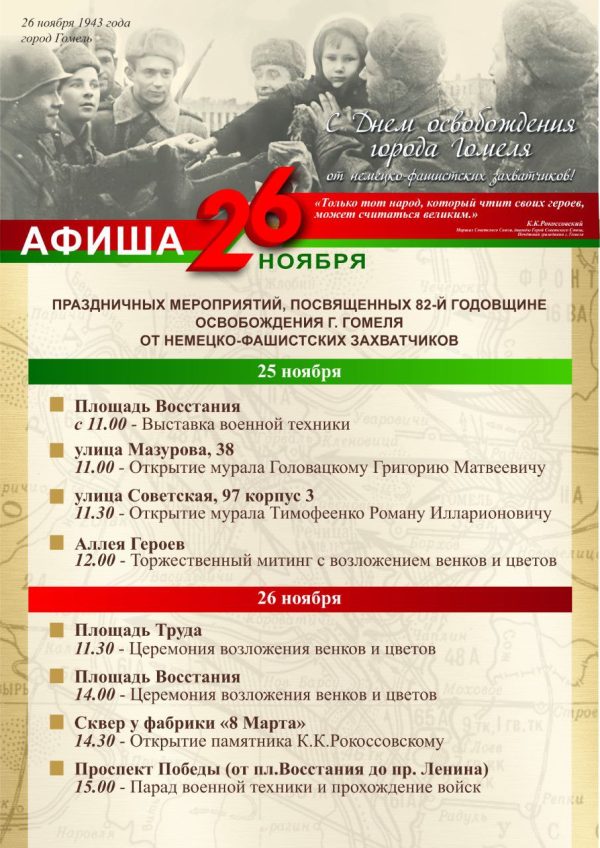 26 ноября 2025 года Гомель отметит 82-ю годовщину освобождения города от немецко-фашистских захватчиков.